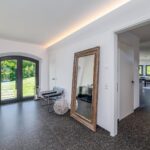 Über eine elegante, geschwungene Treppe, am Haupteingang in der Kahrener Straße, gelangen Sie in die Villa. Das Haus öffnet sich mit einem hellen und einladenden Flur.